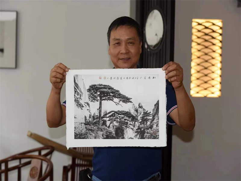 公司總經(jīng)理朱建新應(yīng)攝影大師程劍邀請(qǐng)參加市文聯(lián)創(chuàng)藝基地授牌,作品是黃山攝影大師拍攝的,由黃山市書(shū)法家協(xié)會(huì)主席題了字,是攝影作品與書(shū)法結(jié)合體現(xiàn)在我們生產(chǎn)的紙上的作品,是非常好的創(chuàng)意